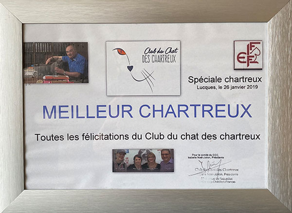 Alla Speciale Certosini svoltasi in Francia a Mentone il 18-19 Gennaio 2014, Tyrone ArdoisetAmbre JW si è qualificato Miglior Certosino maschio adulto ed anche “Best Chartreux Assoluto 2014”.